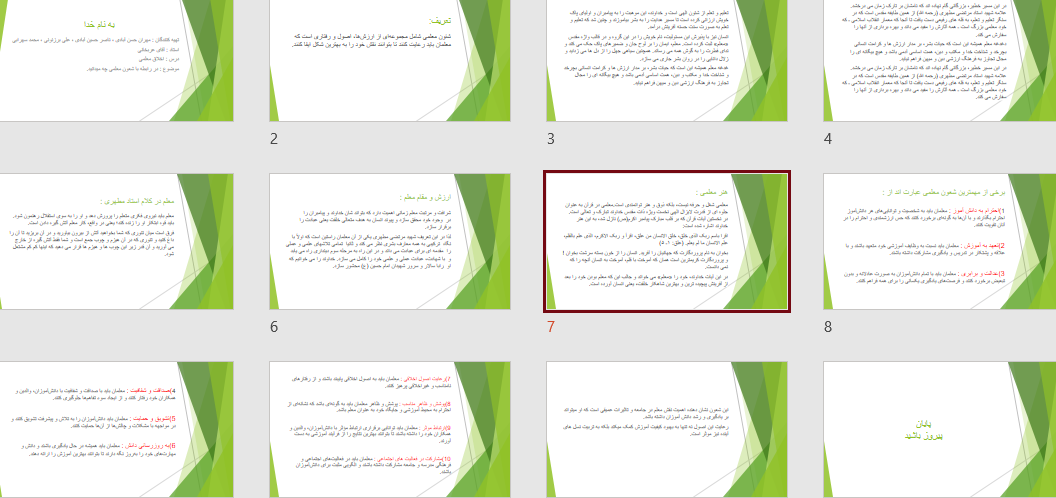 7)رعایت اصول اخلاقی : معلمان باید به اصول اخلاقی پایبند باشند و از رفتارهای نامناسب و غیراخلاقی پرهیز کنند.